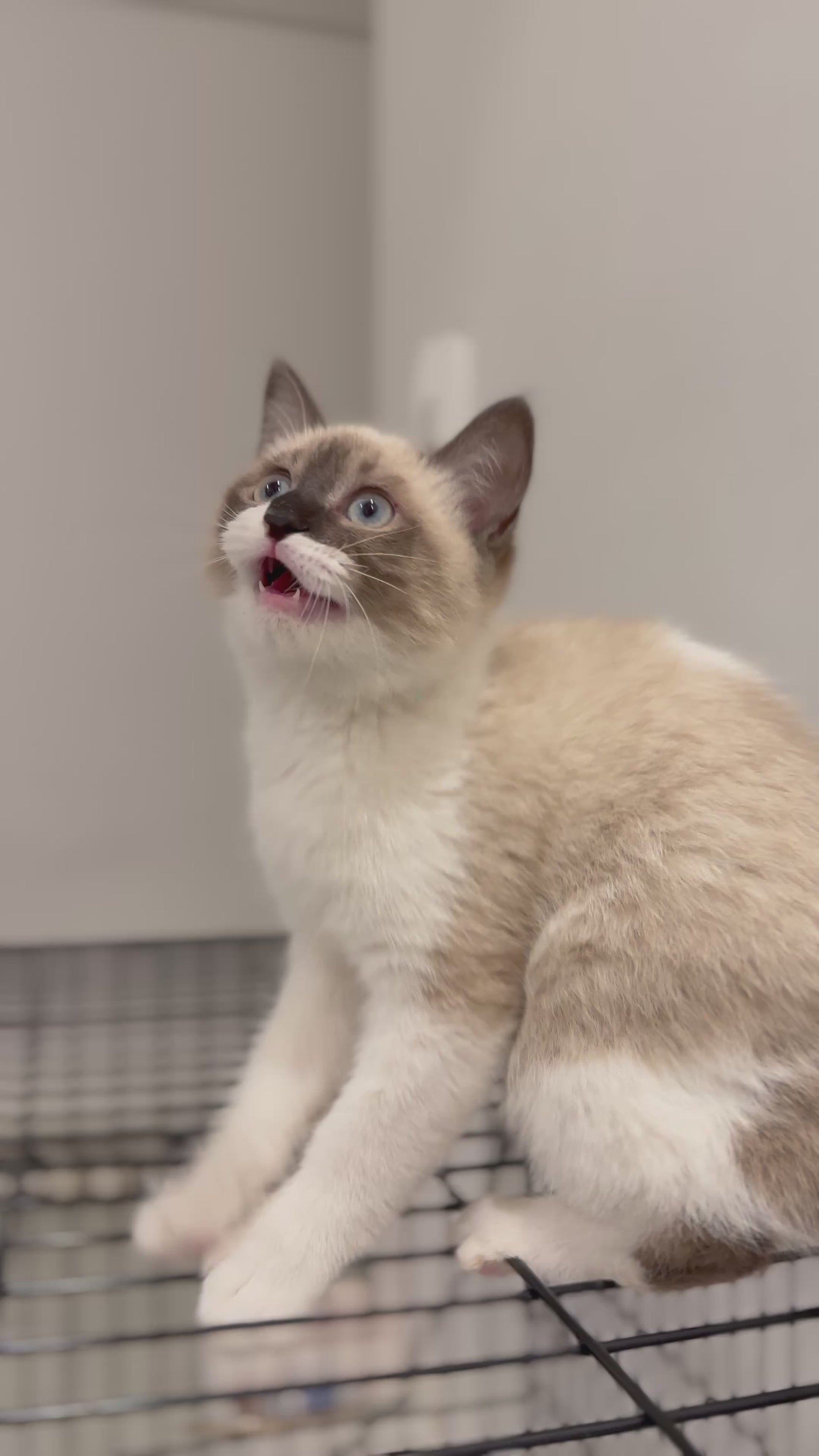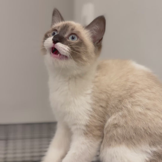 Health: Excellent; bright blue eyes, well-defined dark facial mask typical of Snowshoe cats, soft short beige coat with darker points, and signature white paws that give him a charming look